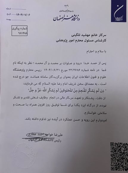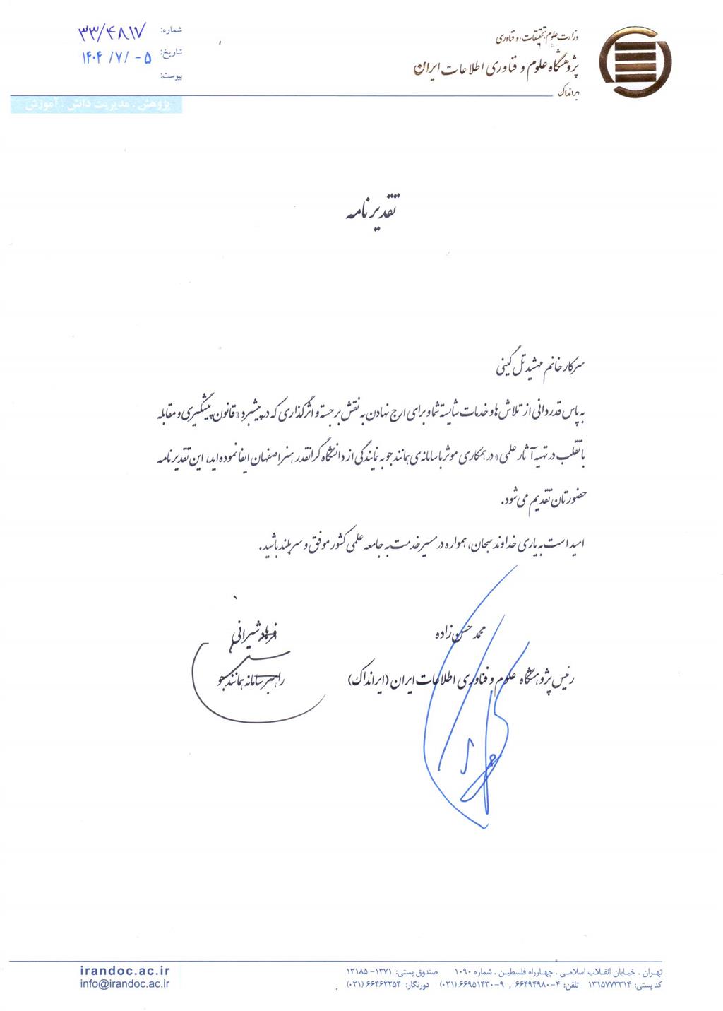 تقدیر از نماینده برتر دانشگاه هنر اصفهان در سامانه همانندجو پژوهشگاه علوم و فناوری اطلاعات ایران